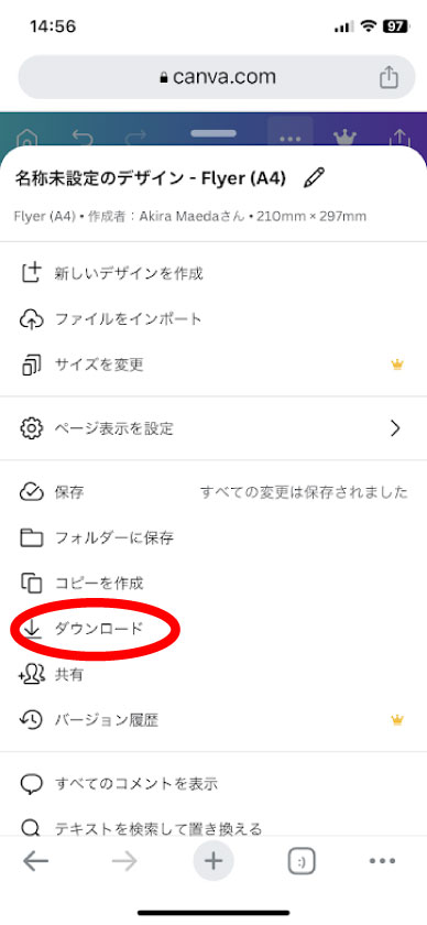 スマホの場合は、赤○印の…をタップして、ダウンロードを選択してください。